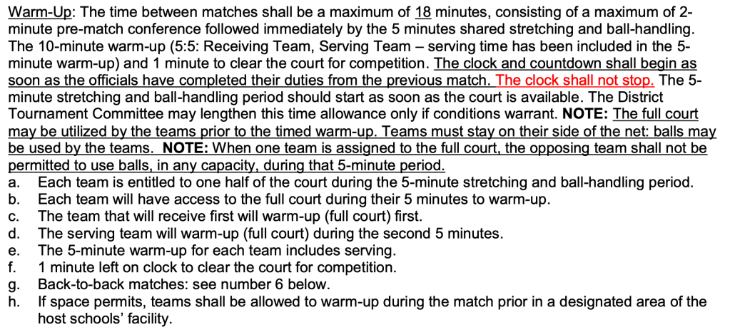 - REMINDER ON WARM UP PROTOCOL: The off team can shag balls during warm-ups as long as the team on the court is okay with it. We’re getting reports that some officials are saying the off team can’t even touch the volleyballs.