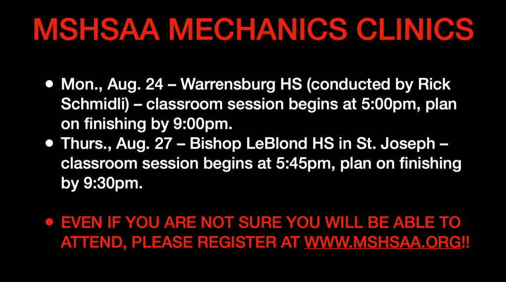 There are two more MSHSAA mechanics clinics in the area (dates and times below). Make sure to register at http://www.mshsaa.org!