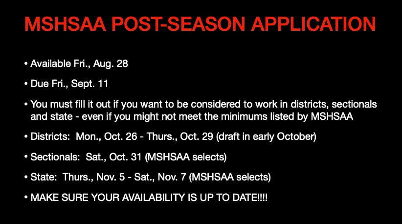 If you want to work post-season, you must fill out the application on the MSHSAA website which will be available soon. Even if you don’t meet the minimum requirements, fill it out anyway. With the potential shortages we have this year, you still might have an opportunity!