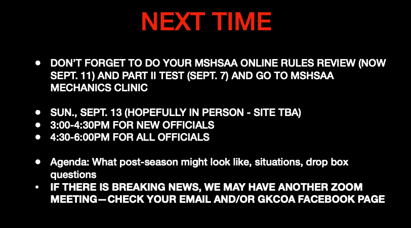 FACE SHIELD CLARIFICATION: We had a question come up during the meeting about whether players can wear a face shield during play, and the answer is no. The NFHS has not approved them, according to MSHSAA. However, officials are allowed to wear them, but probably in addition to a cloth face mask, depending on what the local school district or county says.