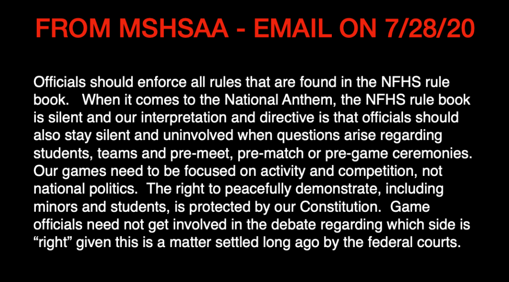 MSHSAA EMAIL TO REFEREES REGARDING POTENTIAL NATIONAL ANTHEM PROTESTS