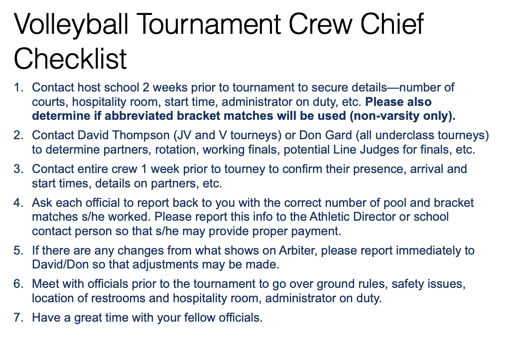 If you are listed first (Referee 1) in Arbiter for a Saturday tournament, congratulations–you are the crew chief! Here is a list of responsibilities that you need to follow: