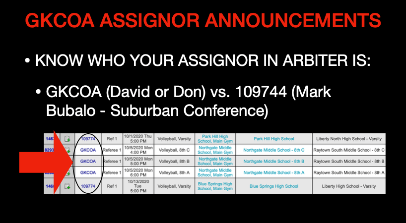 Know who your assignor is–remember Mark Bubalo assigns Suburban Conference dual JV/varsity matches and some tournaments. GKCOA assigns middle school, C-Gold/Silver, varsity line judges, some varsity tournaments, and some varsity/JV matches outside the Suburban Conference. When you have a question about an assignment, make sure to look in Arbiter to see who actually assigned it to you before you send questions to the wrong assignor! (see below to tell the difference)