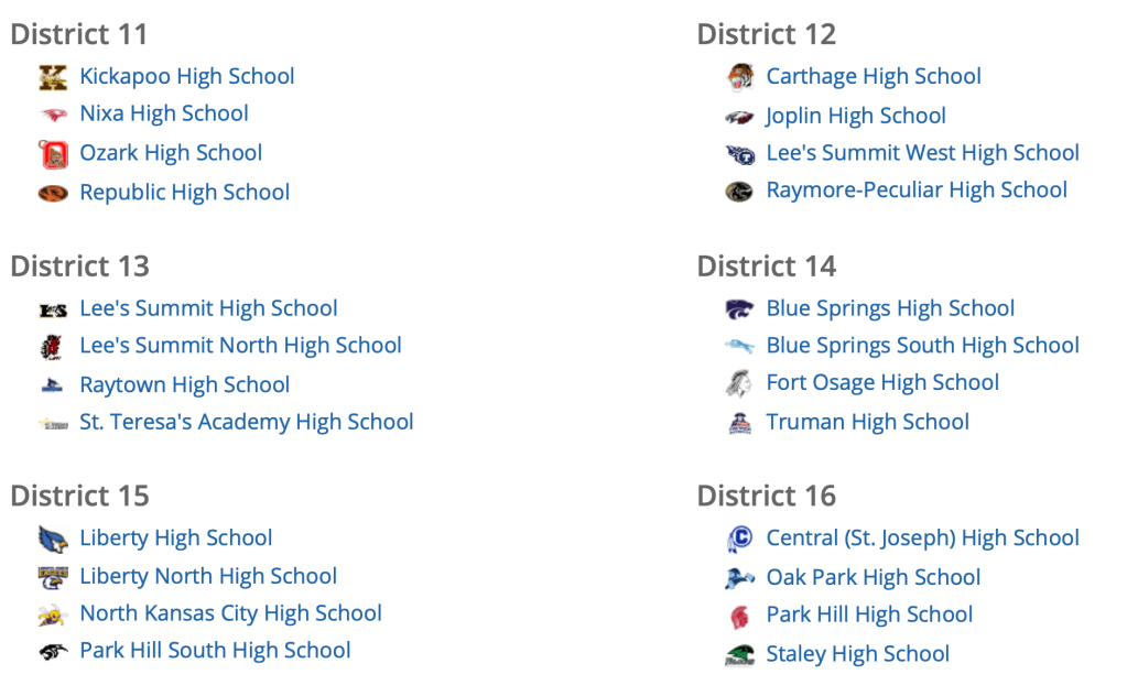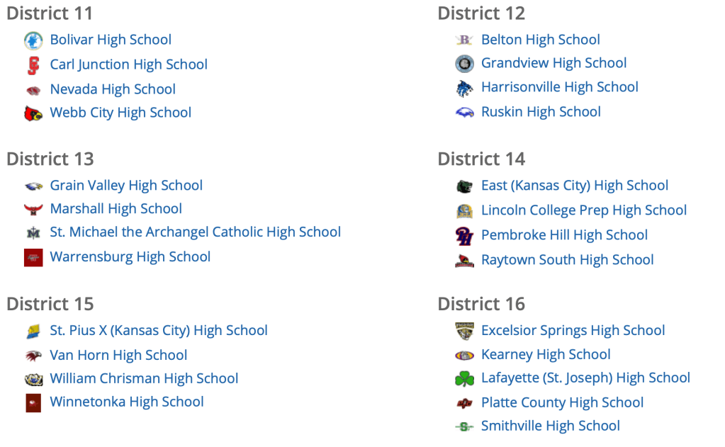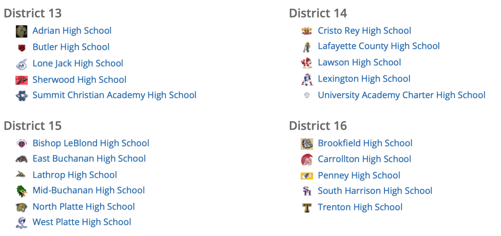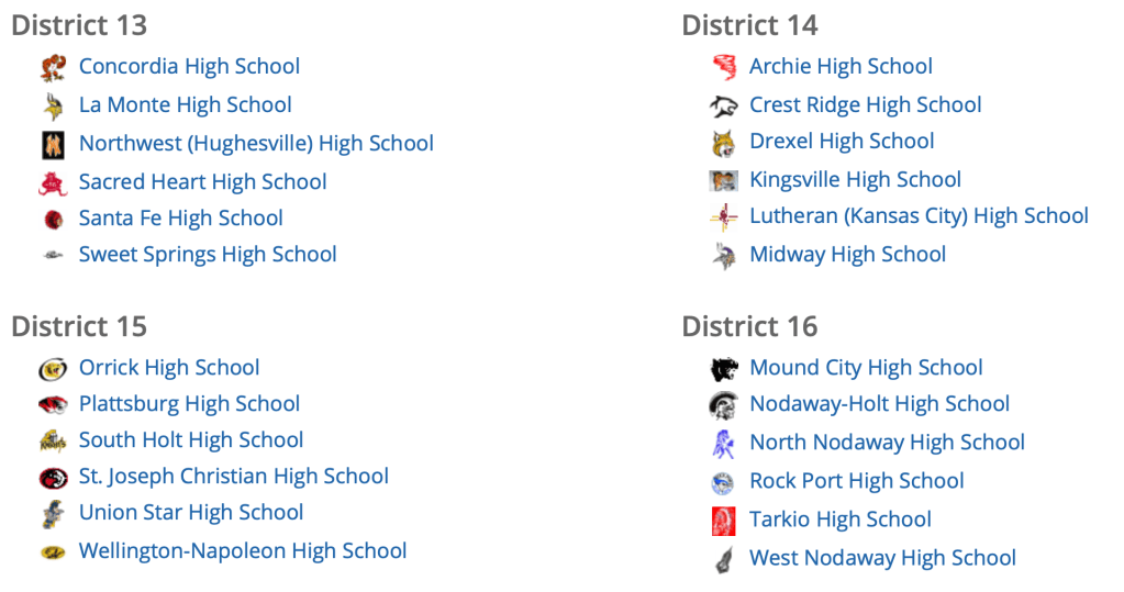 AREA SCHOOLS ONLY (when I cut and pasted the screenshots from the MSHSAA website, I included some non-area districts also–sorry!) – NOT ALL HOSTS HAVE NOT BEEN ANNOUNCED YET – when district tournament managers start calling or emailing you to officiate districts on Tues., Oct. 6, these are the district host schools that will be contacting you.