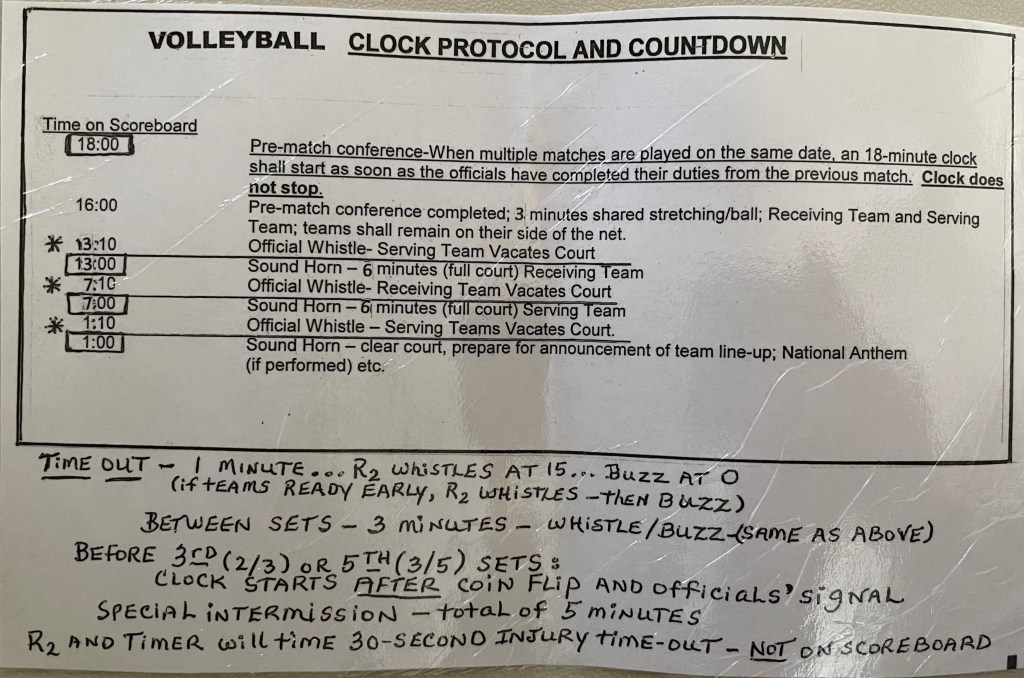 - Our good friend from Sedalia, Nancy Willig, makes laminated sheets (like the one below) to show to timers at the scorer’s table on when the sound the horn for warmups, time outs, and intermissions. If you would like a copy, please email Don at don.sleet.vb@gmail.com to make arrangements.
