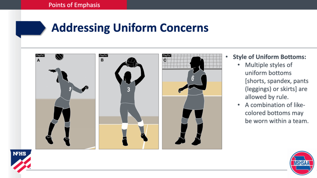 MSHSAA expects our schools to follow all NFHS and MSHSAA rules for the sport of volleyball and our officials to apply these rules consistently across the state,at all levels of play. Anything less impacts the integrity of the game and the opportunity for every player to have a chance to participate. Good luck to everyone on the upcoming season!