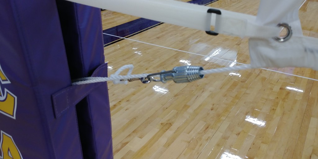 4. Reminder: Metal tensioning devices, such as the one pictured, must be covered. The covering can be a towel, foam pipe insulation, athletic tape–anything that covers exposed metal. Likewise, any chain or cable through the top or bottom of the net must be covered, as well. A plastic coating on a cable is a sufficient covering.
