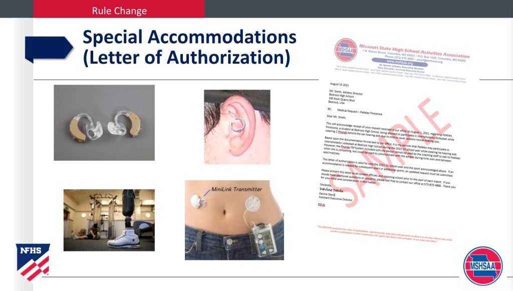 As a reminder, a letter of authorization from MSHSAA for the current school year is required for any player who is wearing a medical device, such as hearing aids, insulin pumps, prosthetics, migraine headache piercings (not an exhaustive list), etc. Refer to this screenshot, taken from the online rules review.