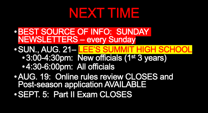 We spent some time at the GKCOA meeting on 8/14/22 regarding how MSHSAA observations were going to be conducted between Ken Corum and Dixie Ousley. If you wish to be observed, please email one or both observers. See the meeting video/powerpoint for more details.